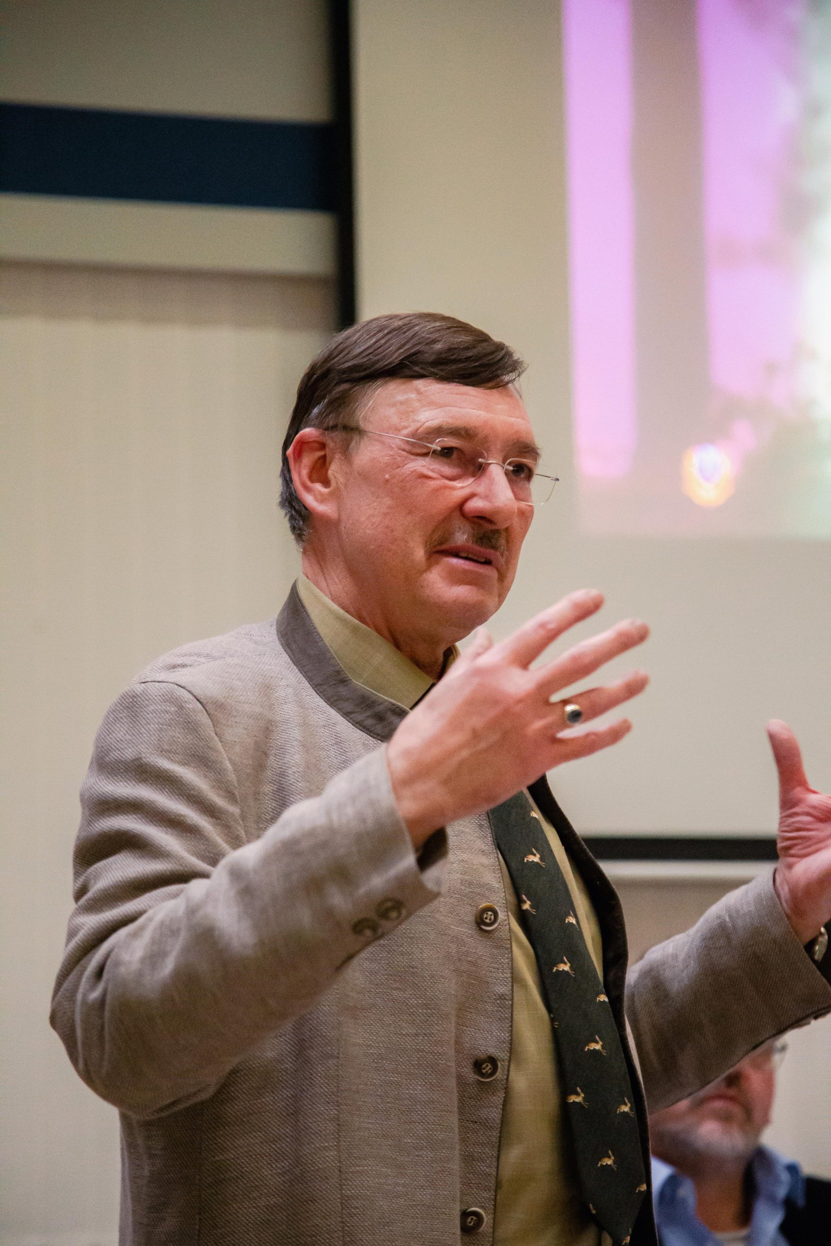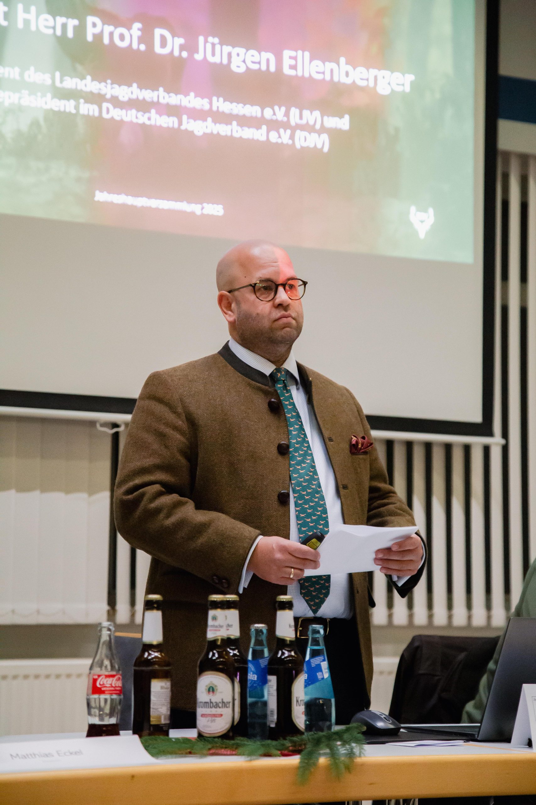 Ein besonderer Höhepunkt war der Besuch von Prof. Dr. Jürgen Ellenberger, Präsident des Landesjagdverbandes Hessen und Vizepräsident im Deutschen Jagdverband e.V. . Er war neben dem Grußwort zudem zu einem weiteren besonderen Anlass angereist, um Heinrich Engelhard für dessen langjährige Verdienste zu ehren. Engelhard erhielt die Ehrennadel des LJV in Silber, eine Auszeichnung, die seine herausragende Arbeit und sein jahrzehntelanges Engagement im Vorstand würdigt. In seinem Grußwort ging Ellenberger auf die vielfältigen Aufgaben der Jägerschaft ein und unterstrich die Bedeutung einer aktiven Öffentlichkeitsarbeit in den sozialen Medien, deren Ausbau er ausdrücklich begrüßte.